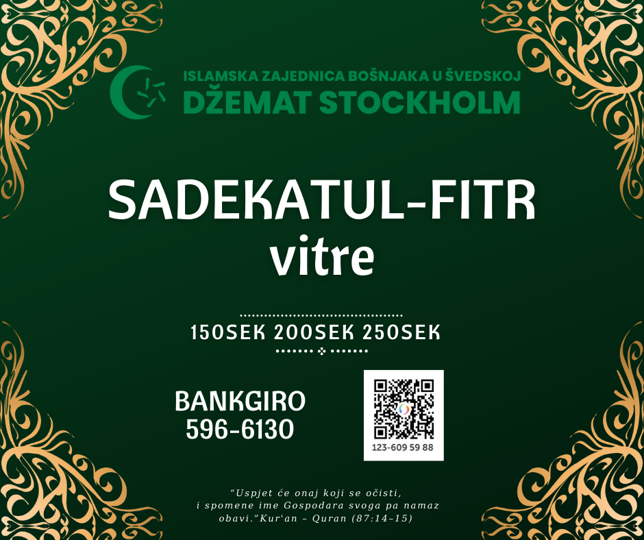 Odlukom Rijaseta Islamske zajednice u BiH, Sadekatu-l-fitr /VITRE/ po osobi, za područje Švedske, je podijeljen u tri kategorije: a) 250 SEK, b) 200 SEK i c) 150 SEK. Na osnovu vašeg ekonomskog stanja sami odlučite kojoj kategoriji pripadate.